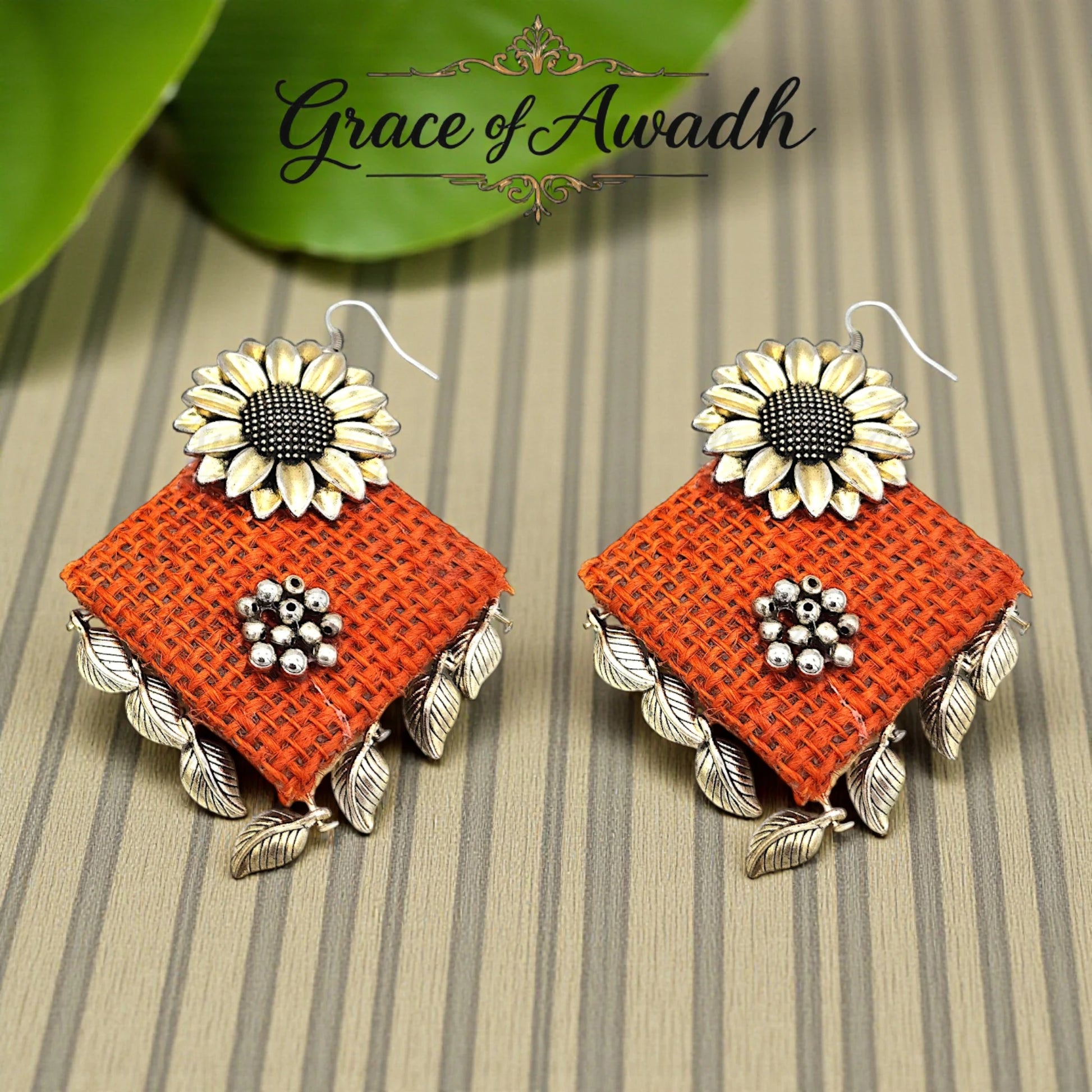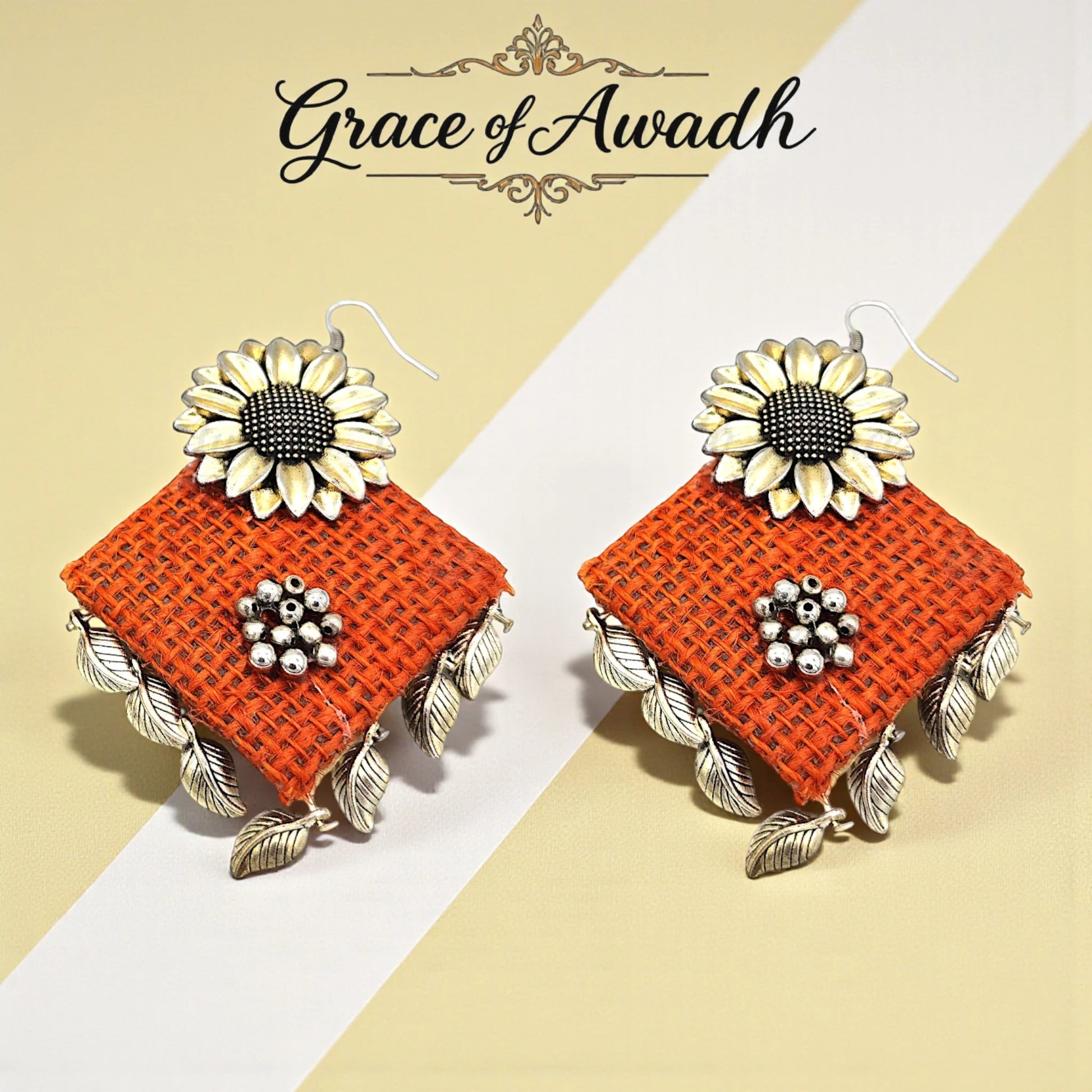 Handcrafted orange fabric danglers featuring an antique sunflower motif, accented with silver beads and leaf charms. Lightweight yet statement-worthy, perfect for festive and casual looks.